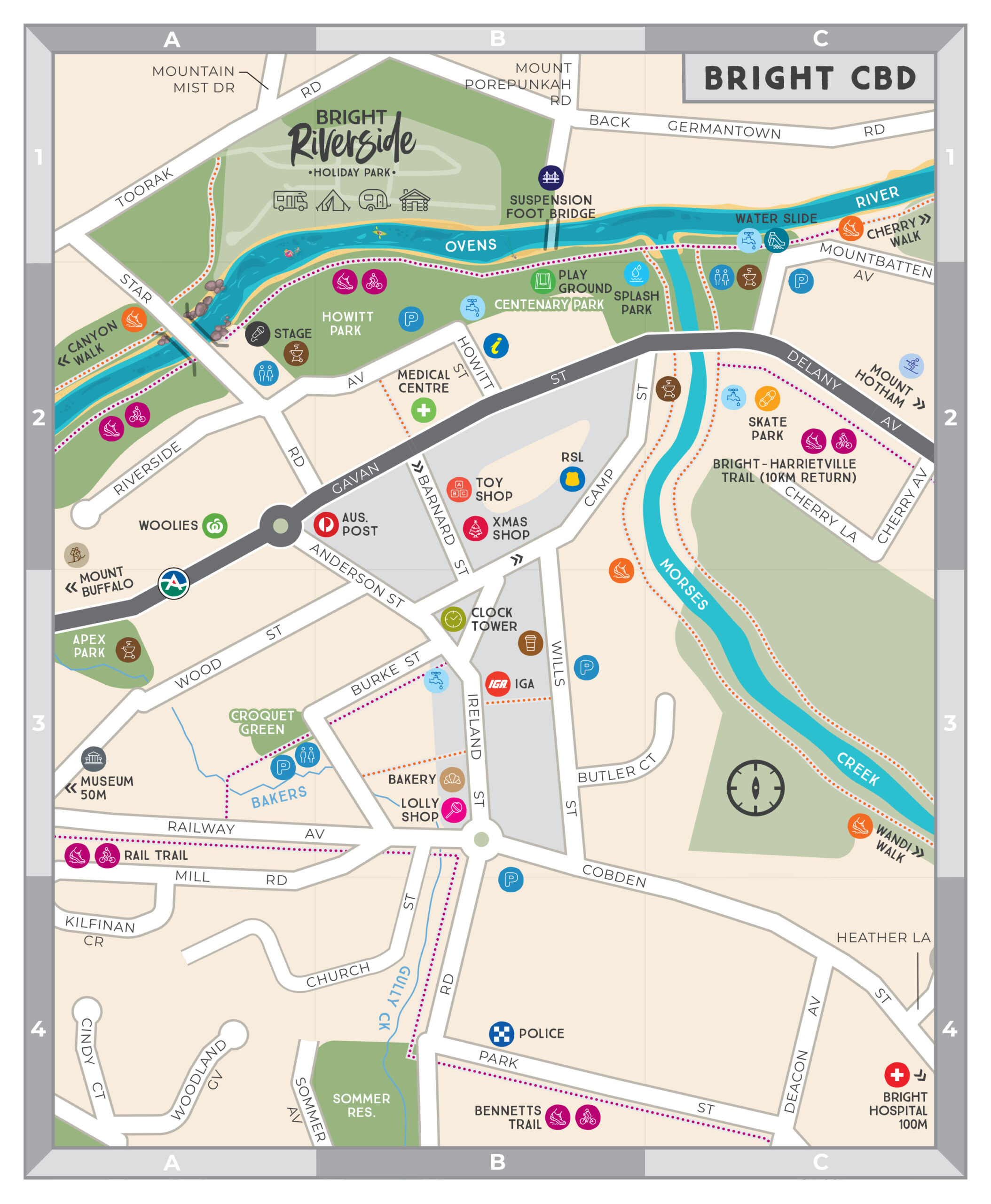 Familiarise yourself with our map of Bright’s CBD, to make your holiday planning easy and unforgettable.