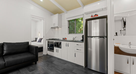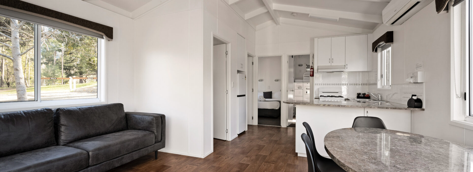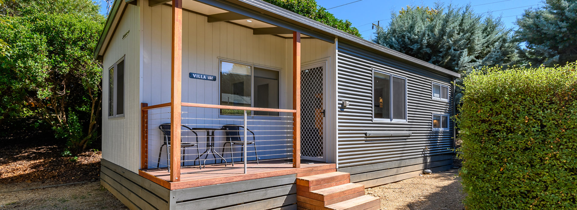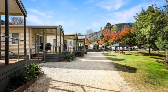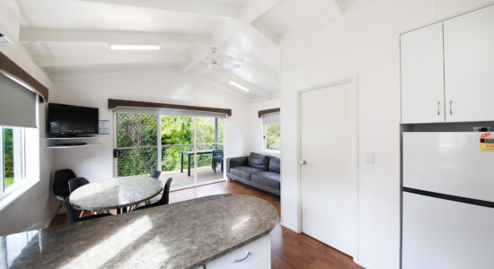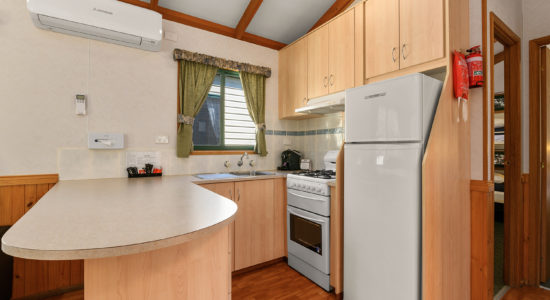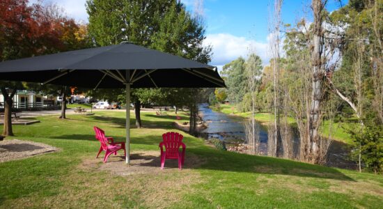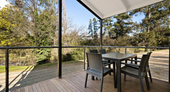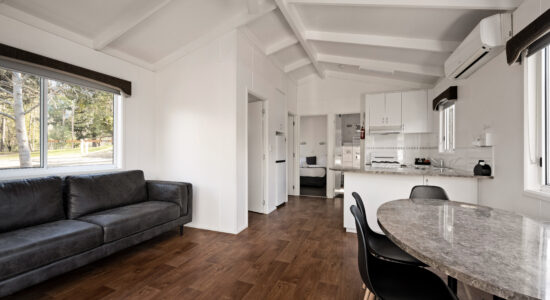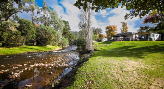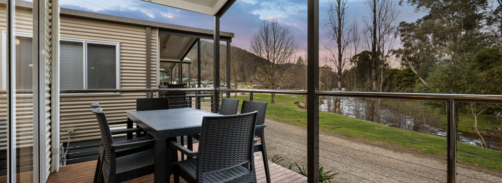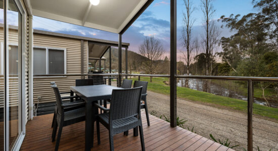 Our villas are situated alongside the picturesque Ovens River, providing you with stunning river views. The main bedroom is equipped with a comfortable queen bed and the second bedroom features two bunk beds with four sleeping spaces in total. You will find all the necessary bedding and towels provided in the villa. The kitchen is fully equipped with all the essentials including a fridge, microwave, hotplates, grill, kettle, toaster, electric frypan, and utensils. The living area is furnished with a lounge chair, a dining set, and a TV, and is fitted with a reverse cycle air conditioner for your comfort. Additionally, you can relax on your balcony and enjoy the beautiful views of the Ovens River.