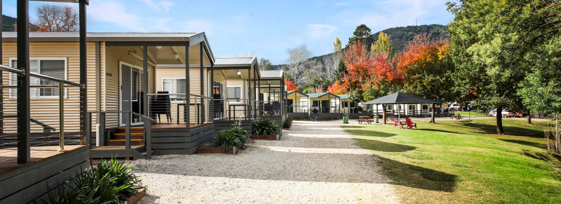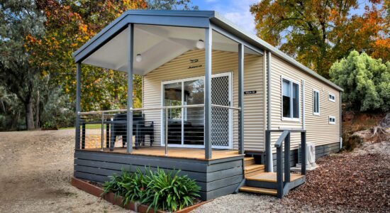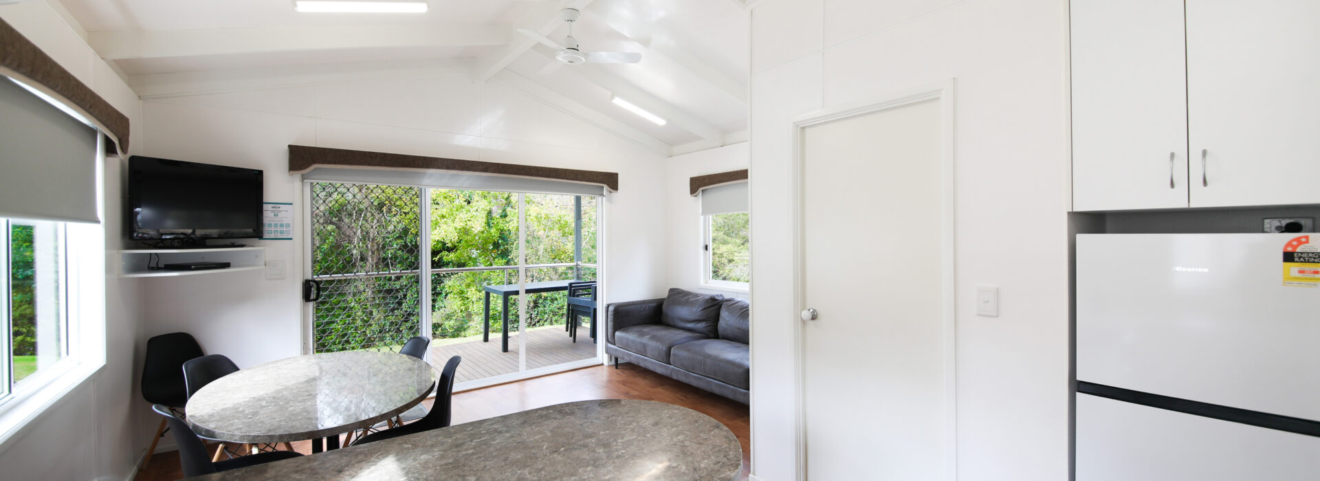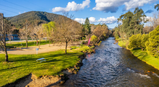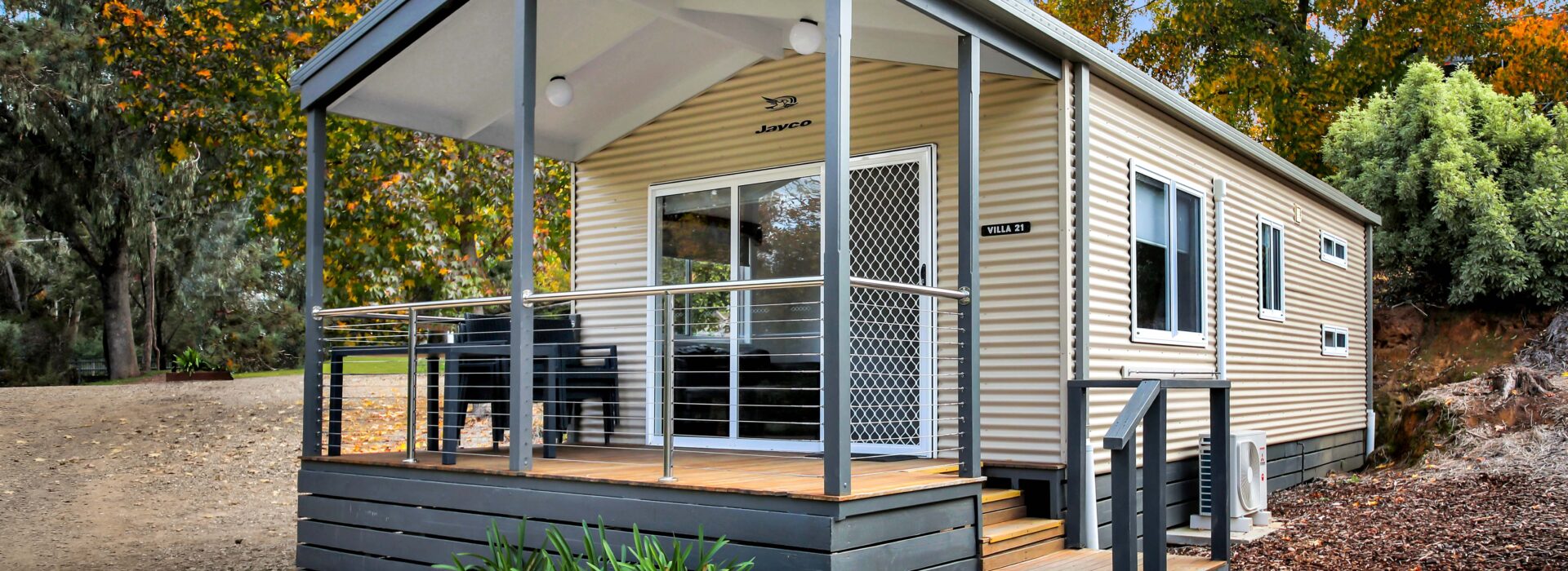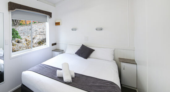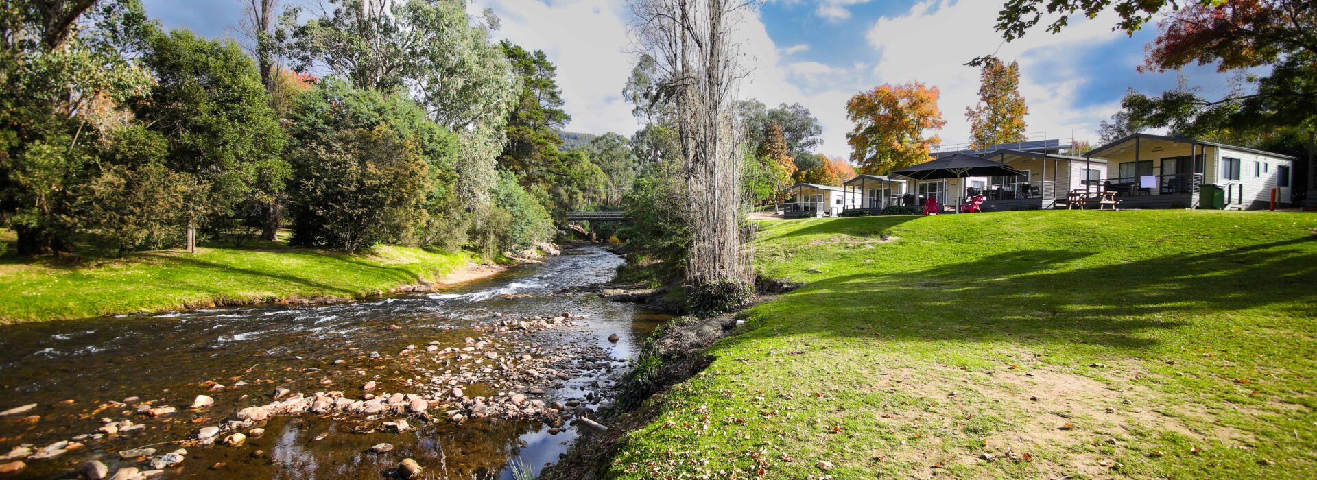 Our villas are situated alongside the picturesque Ovens River, providing you with stunning river views. The main bedroom is equipped with a comfortable queen bed and the second bedroom features two bunk beds with four sleeping spaces in total. You will find all the necessary bedding and towels provided in the villa. The kitchen is fully equipped with all the essentials including a fridge, microwave, hotplates, grill, kettle, toaster, electric frypan, and utensils. The living area is furnished with a lounge chair, a dining set, and a TV, and is fitted with a reverse cycle air conditioner for your comfort. Additionally, you can relax on your balcony and enjoy the beautiful views of the Ovens River.