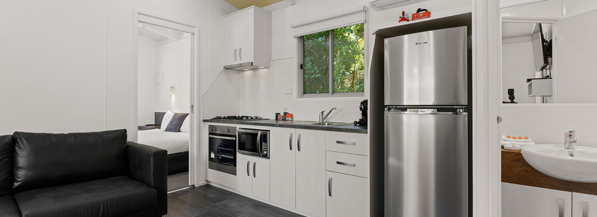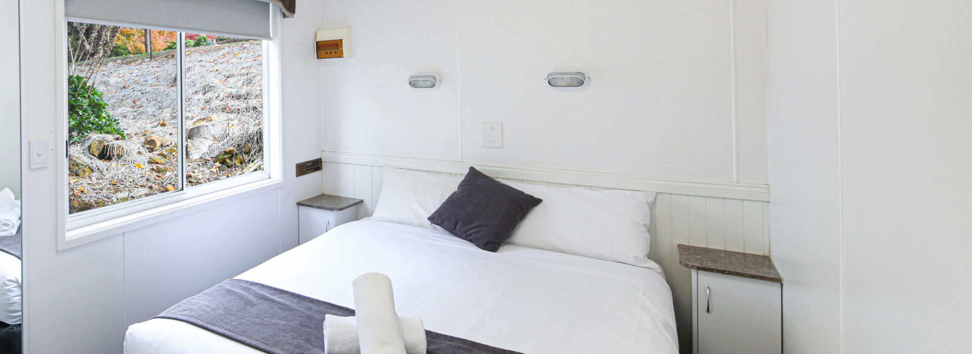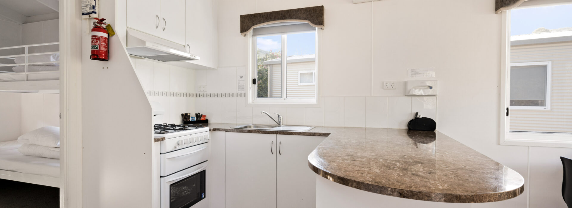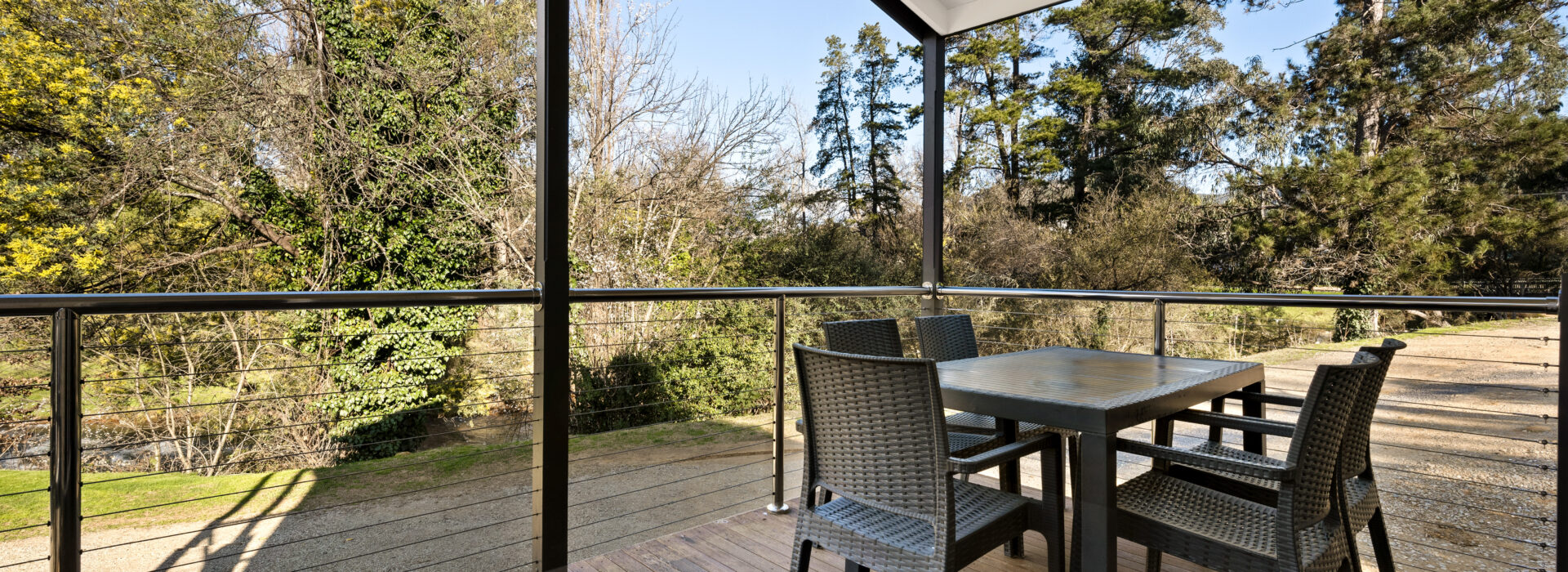 Our villas are situated alongside the picturesque Ovens River, providing you with stunning river views. The main bedroom is equipped with a comfortable queen bed and the second bedroom features two bunk beds with four sleeping spaces in total. You will find all the necessary bedding and towels provided in the villa. The kitchen is fully equipped with all the essentials including a fridge, microwave, hotplates, grill, kettle, toaster, electric frypan, and utensils. The living area is furnished with a lounge chair, a dining set, and a TV, and is fitted with a reverse cycle air conditioner for your comfort. Additionally, you can relax on your balcony and enjoy the beautiful views of the Ovens River.